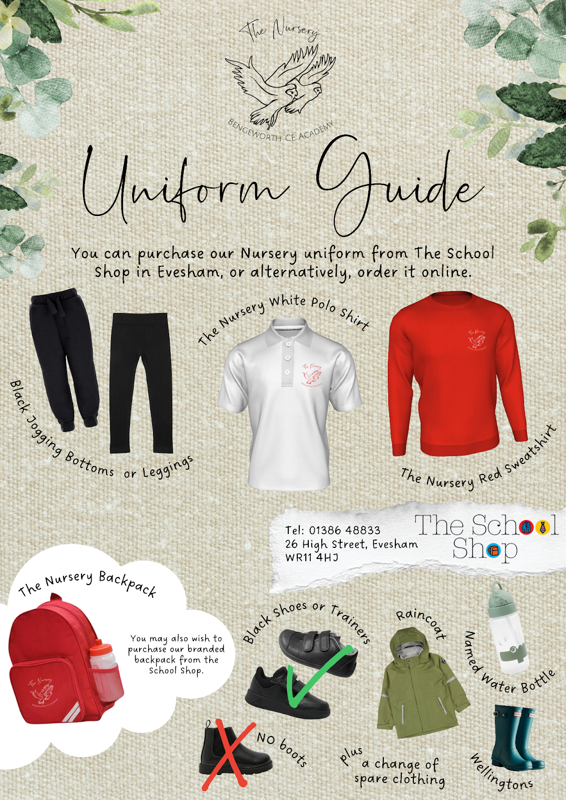 Due to the nature of learning opportunities and seamless access to the indoor and outdoor learning environment your child will be expected to wear comfortable black joggers or leggings, black shoes and trainers are preferred and ‘The Nursery at Bengeworth CE Academy’ polo shirt and jumper or cardigan. These will be available from The School Shop, Evesham at a reasonable cost. You may also wish to purchase our branded backpack. As your child will be outside in all weather conditions, wellies, a waterproof coat and a change of clothing will be required. Your child will also need a named water bottle.